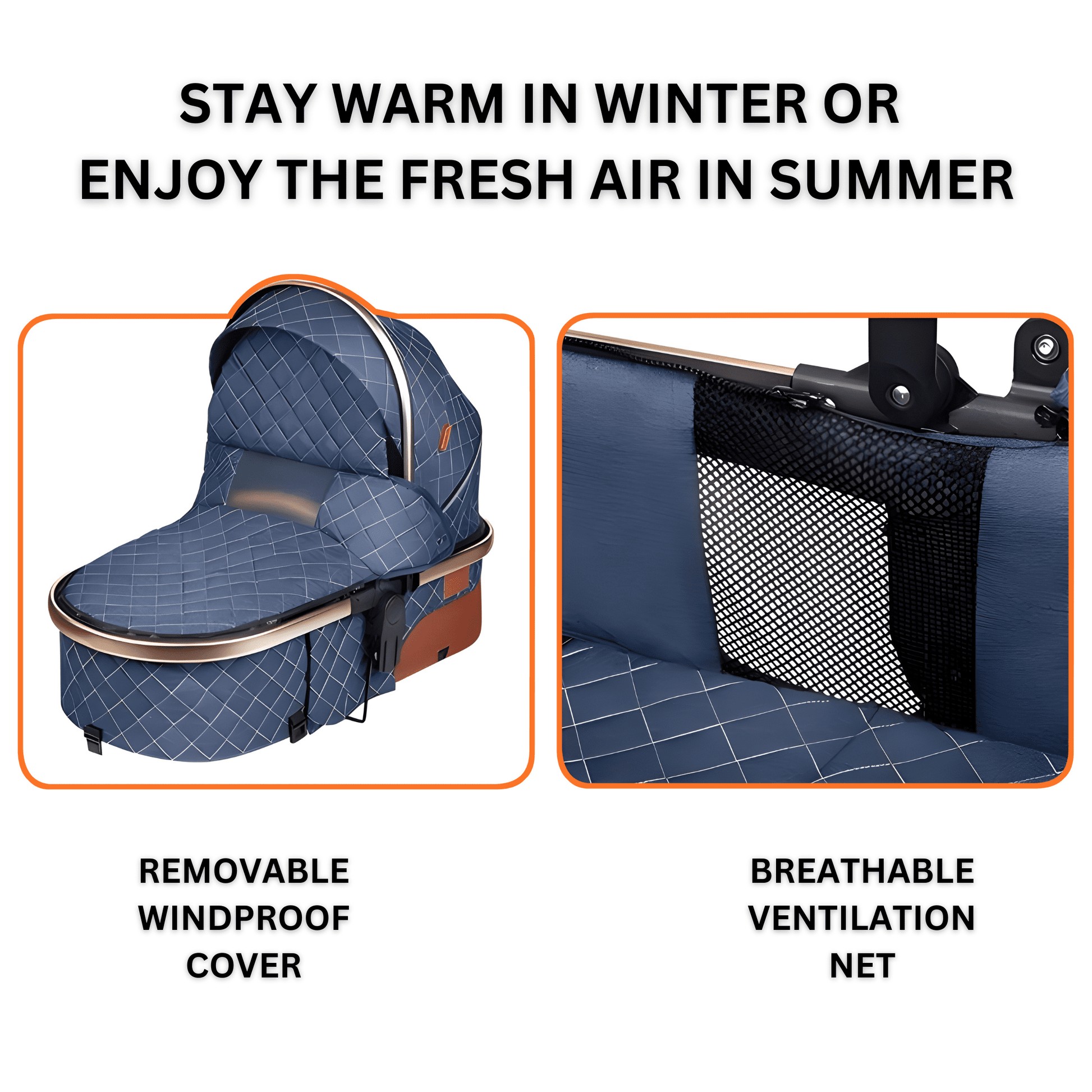 Meet the Luxury 2-in-1 Baby Stroller, designed to be the perfect blend of elegance and practicality for on-the-go par-ents. With its modern, stylish design and premium materials, this stroller offers a range of features that make parent-ing easier.